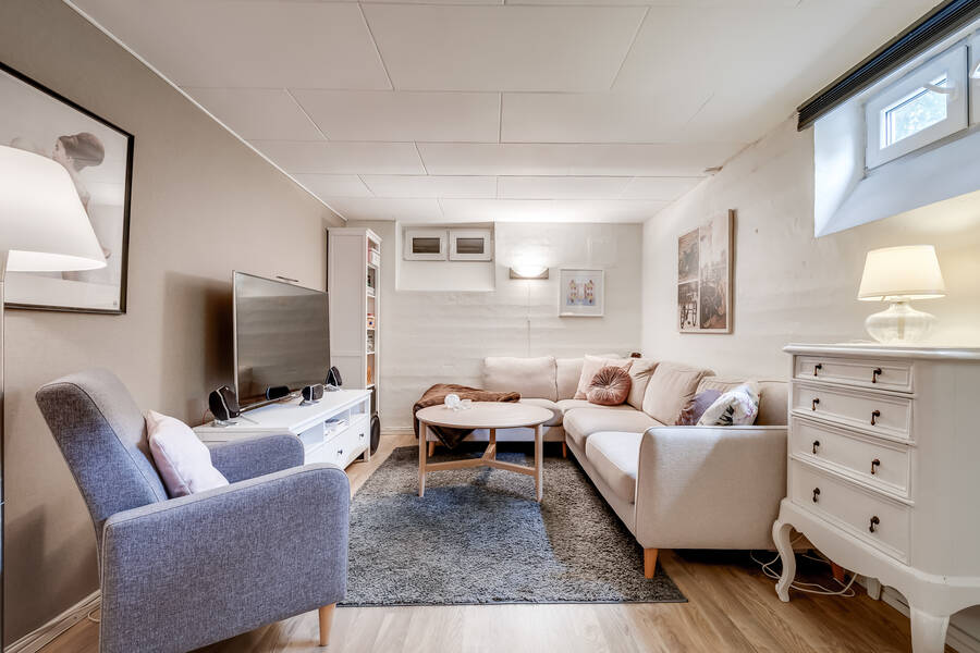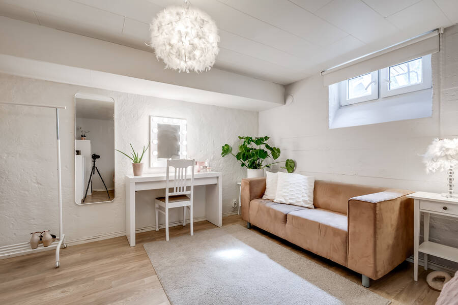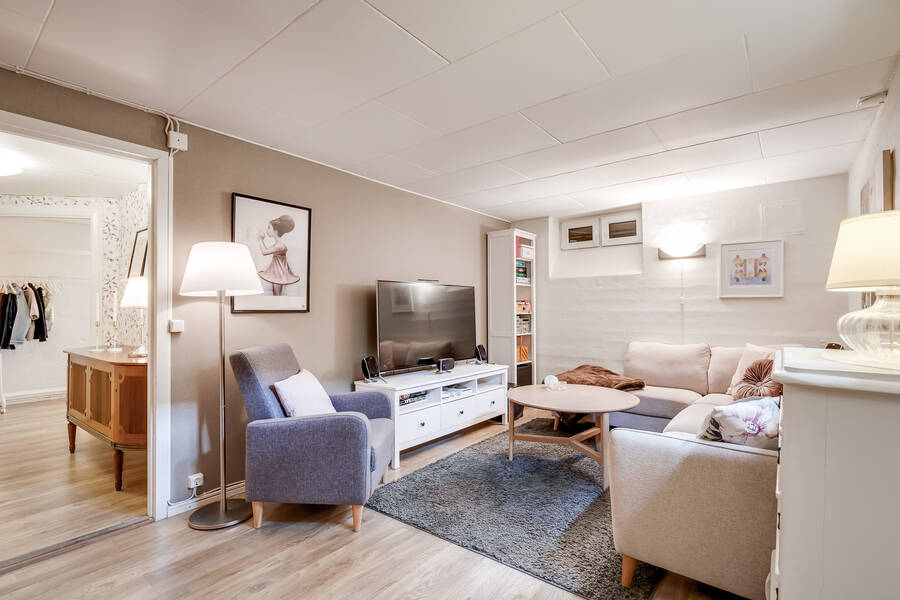 Här ligger ett laminatgolv och ytskikten är både målad betong och en neutral tapet som skapar en ombonad känsla trots det begränsade ljusinsläppet från de små källarfönstren. Värmande vattenburen golvvärme. Rummet rymmer utan problem en hörnsoffa och en mediamöbel och bakom draperiet under trappan finns smart förvaring för säsongsprylar eller leksaker. Plats för mer förvaringsmöbler längs väggarna ger extra utrymme för filtar och spel. Den dämpade belysningen gör rummet till en perfekt plats för filmkvällar eller en avkopplande läshörna.