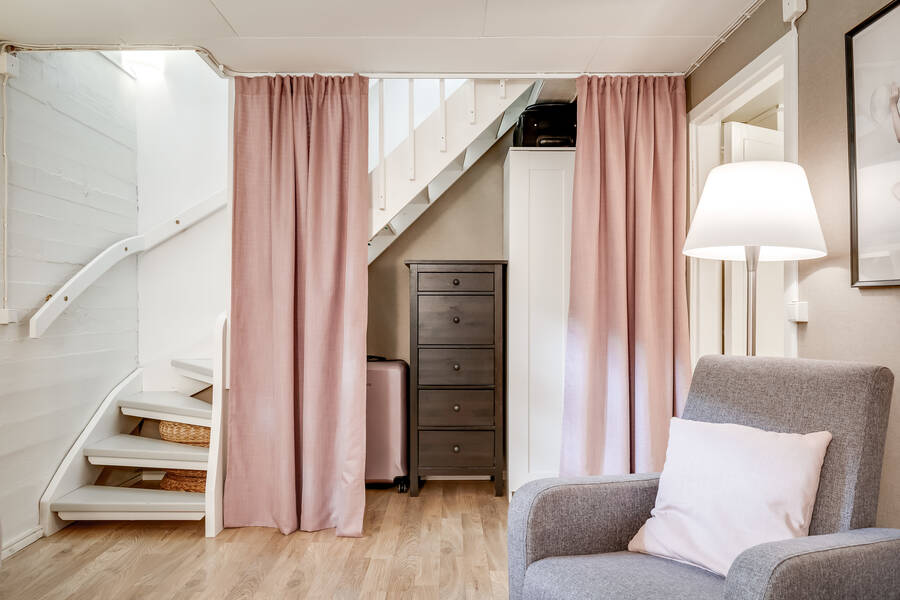 Från vardagsrummet nås nedre plan genom en trapp i gediget trä.