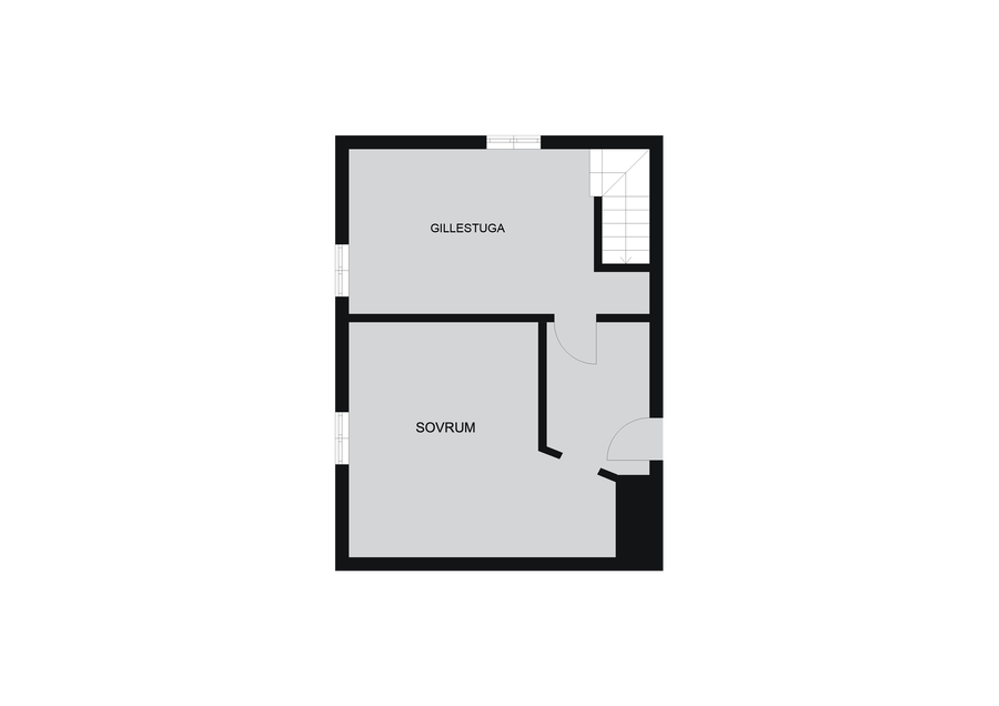 Sovrum 3 har samma laminatgolv och väggar i vitt och ljusgrå tapet, med råbetong som ger textur och en modern känsla. De högt placerade fönstren släpper in dagsljus utan att kompromissa integriteten. Rummet rymmer en dubbelsäng samt en arbetsplats eller läshörna, och längs ena väggen finns plats för både byråer och fristående garderober med gott om förvaring. De fria ytorna är enkla att anpassa med extra hyllor eller skåp under trappan, vilket skapar flexibla förvaringslösningar.
