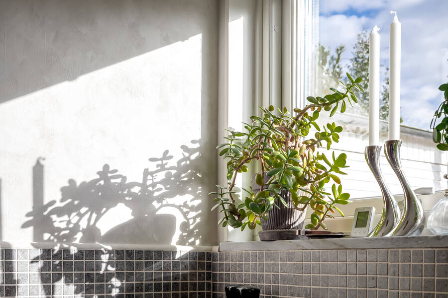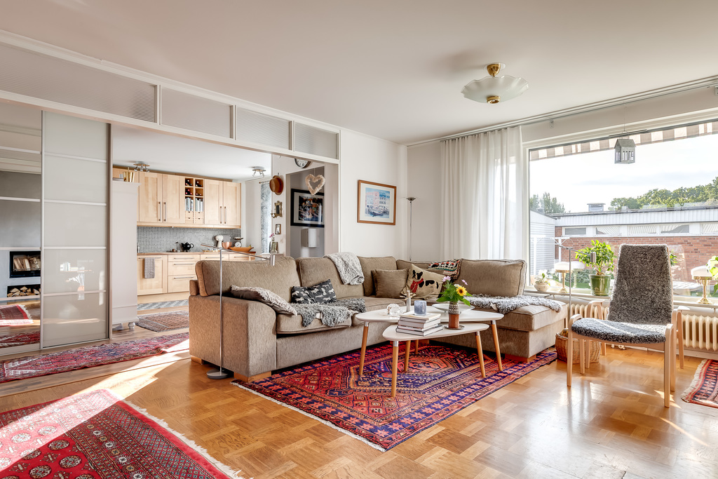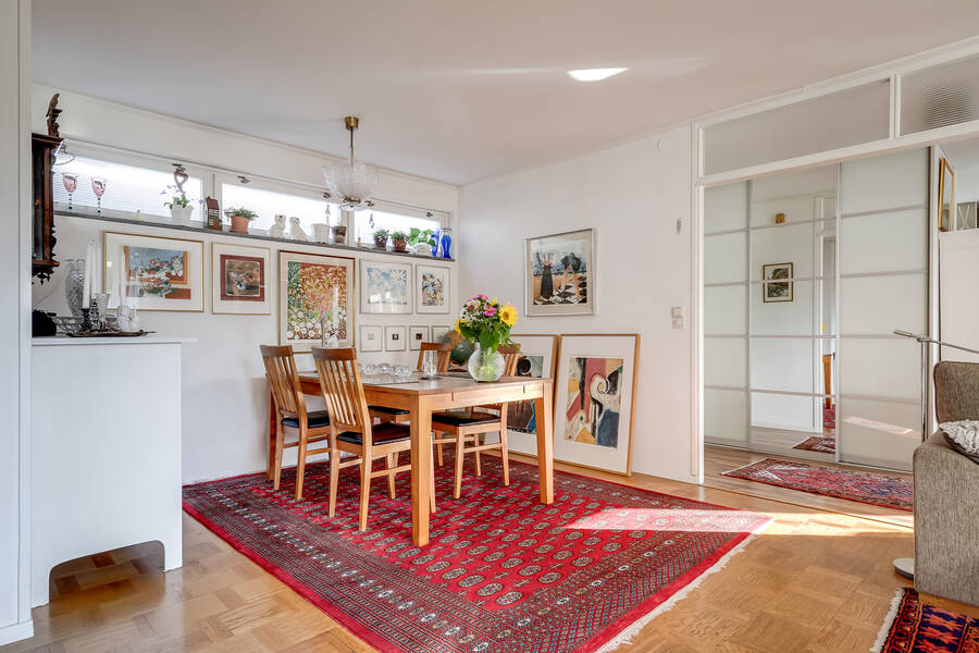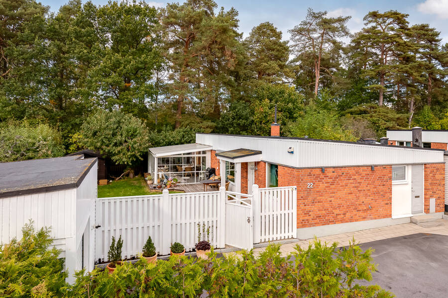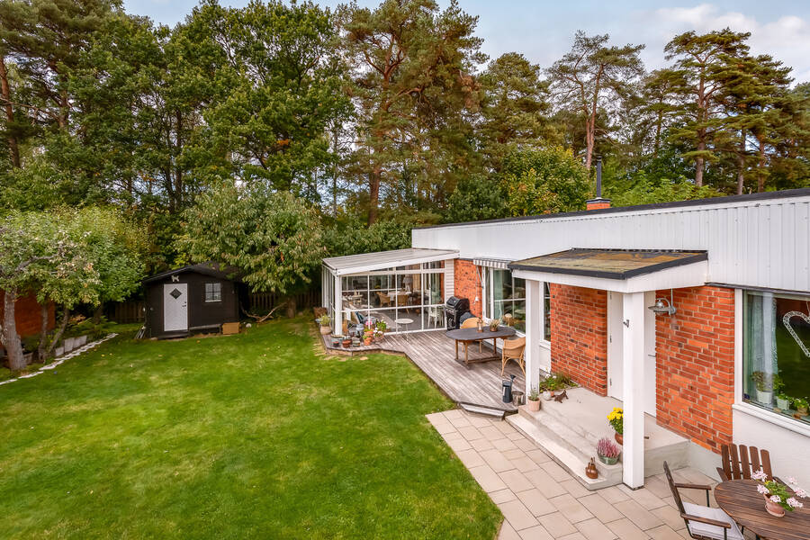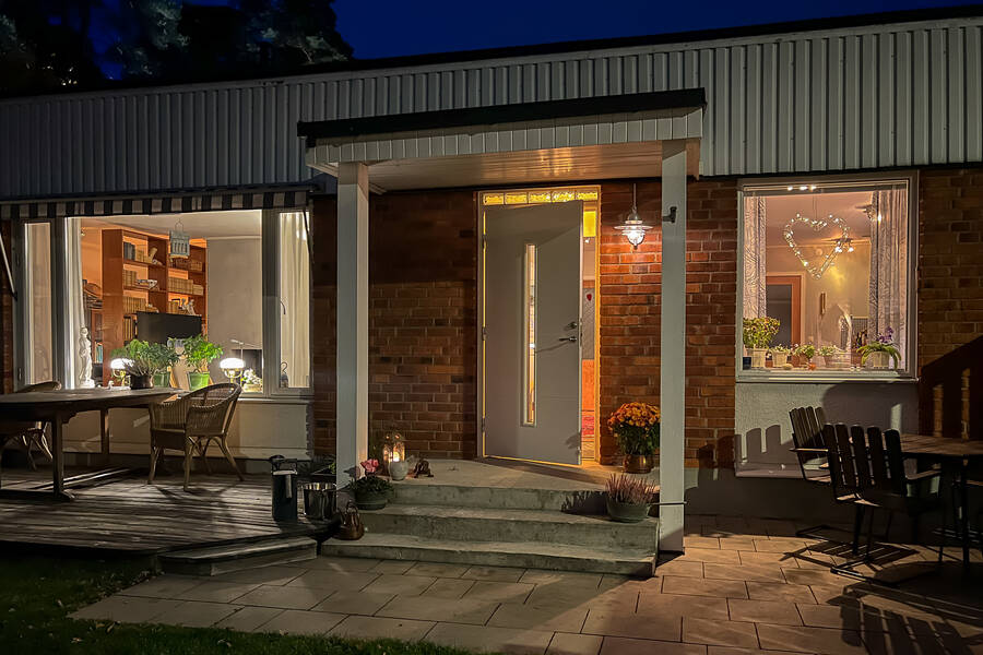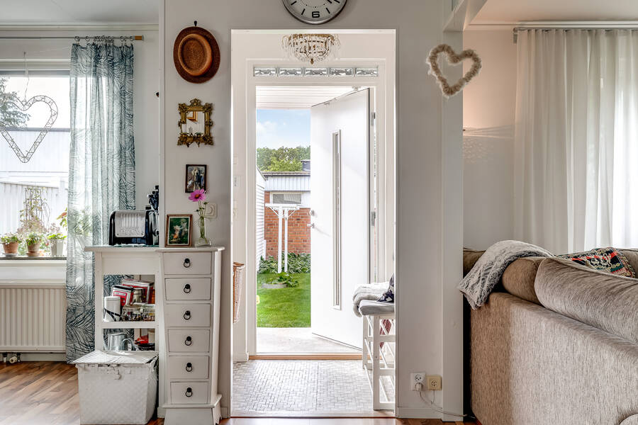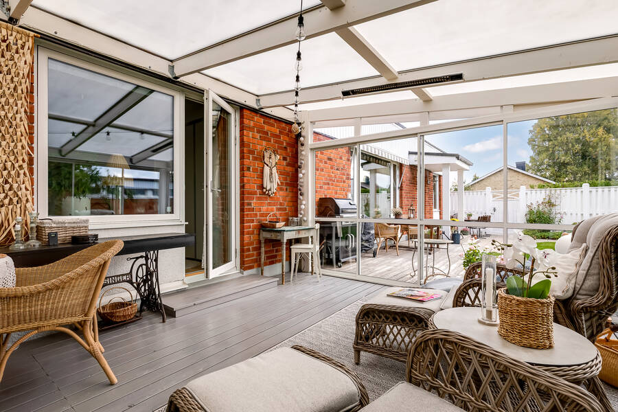 Redan när du kliver in möts du av värmen från den öppna spisen och ljuset som flödar genom de stora fönstren mot trädgården. Den öppna planlösningen mellan kök och vardagsrum gör det enkelt att umgås – vare sig det är till vardags med en kopp te eller under helgens middagar. Från sovrummet når du den stora, inglasade altanen – en älskad plats där årstiderna får komma nära och där middagar kan förlängas långt in på sensommarnatten.