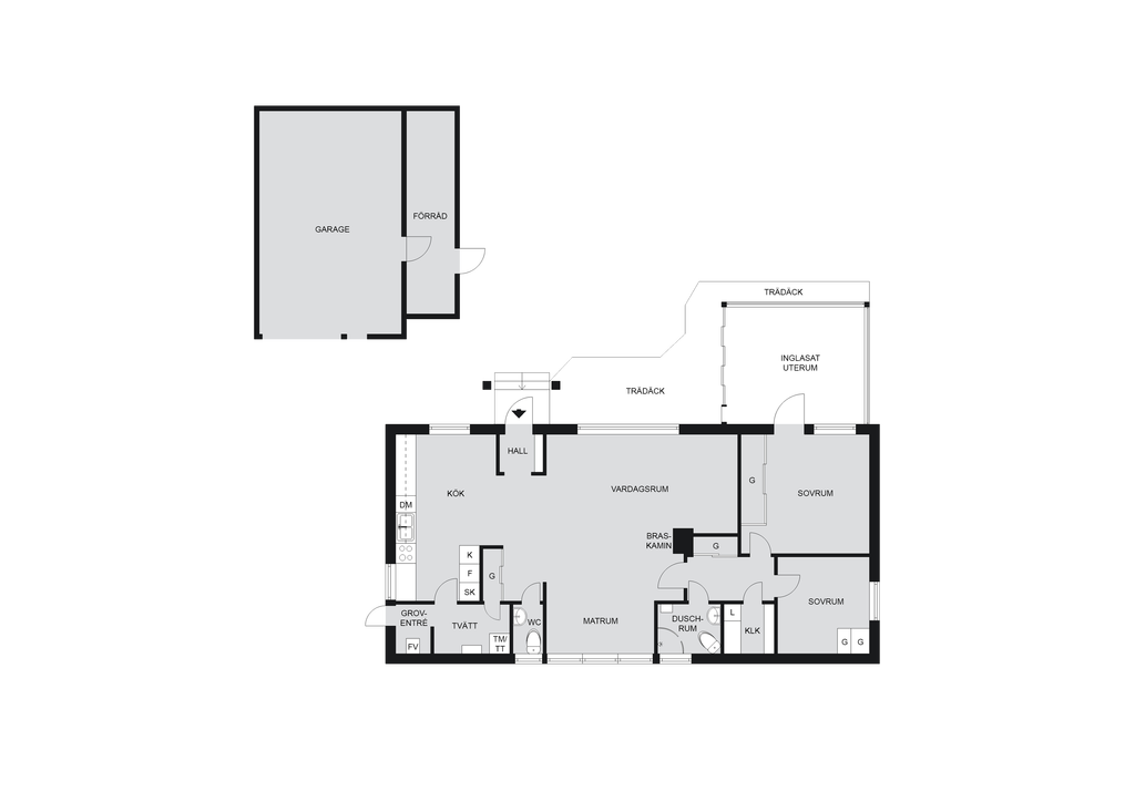 Köket är både funktionellt och hemtrevligt med gott om förvaring och arbetsytor. Tvättstuga med groventré ger bekvämlighet i vardagen, och garaget med laddmöjlighet samt extra förråd gör livet praktiskt och ordnat.