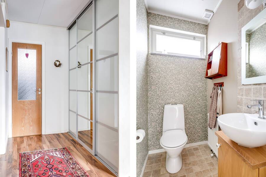 Mellan kök och allrum ligger gästtoaletten som renoverades 2023 med ny tapet, nytt handfat och toalettstol. Ett vädringsfönster bidrar med både ljus och god ventilation.