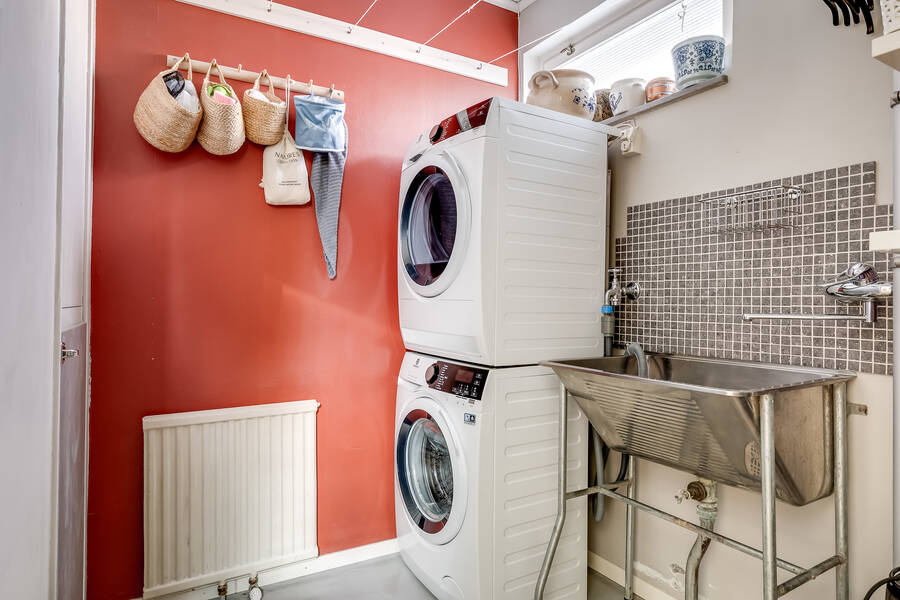 I anslutning till köket ligger den praktiska tvättstugan med tvättmaskin, torktumlare och tvättho. Härifrån når du också groventrén, där fjärrvärmeanläggningen är placerad. Den avger värme som gör rummet till en perfekt plats för att torka blöta ytterkläder efter en regnig dag.