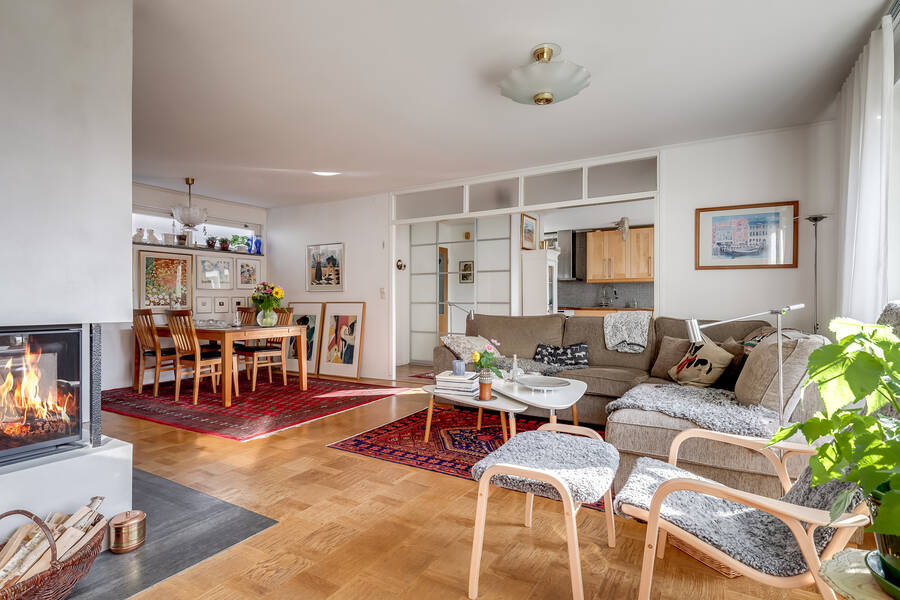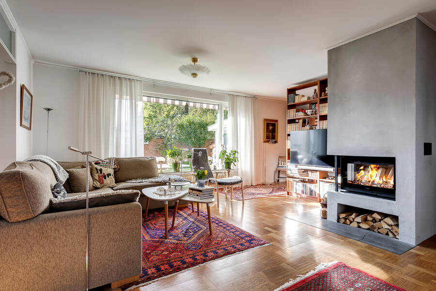 Det ljusa och trevliga vardagsrummet badar i ljus tack vare stora fönster mot den insynsskyddade trädgården i söderläge. Här finns en inbjudande öppen spis med insats som sprider värme och atmosfär. Rummet erbjuder gott om plats för både soffhörna och matbord, vilket gör det till hemmets självklara samlingspunkt.