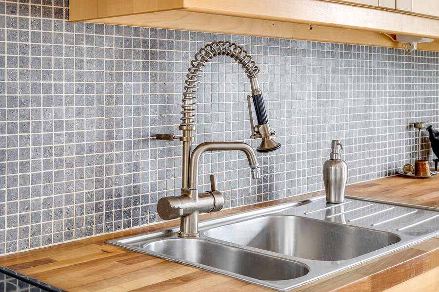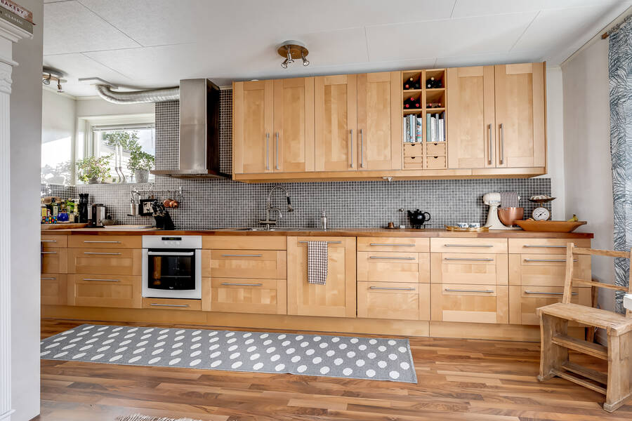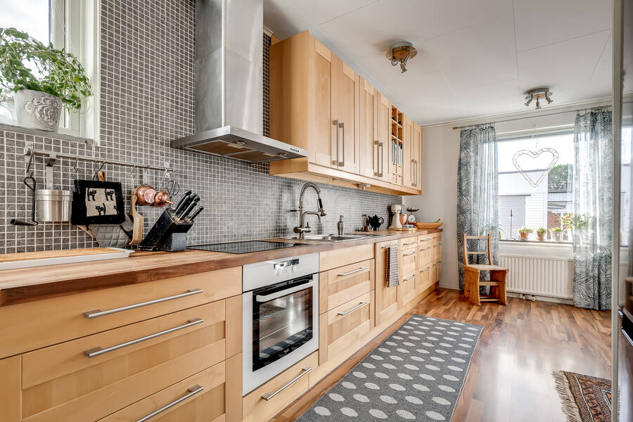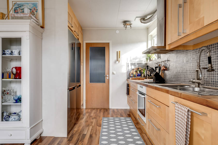 Det ljusa och trevliga köket är utrustat med skåpsluckor i björk och arbetsbänkar i gedigen valnöt. Mosaiken ovanför arbetsytorna fungerar både som stänkskydd och stämningsfull detalj. Här finns spishäll med fläkt, inbyggnadsugn, diskmaskin och två kyl/frysar i rostfritt – perfekt för den matlagningsintresserade.