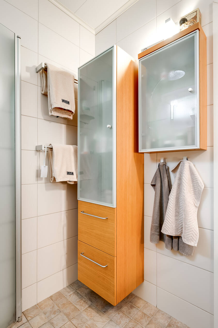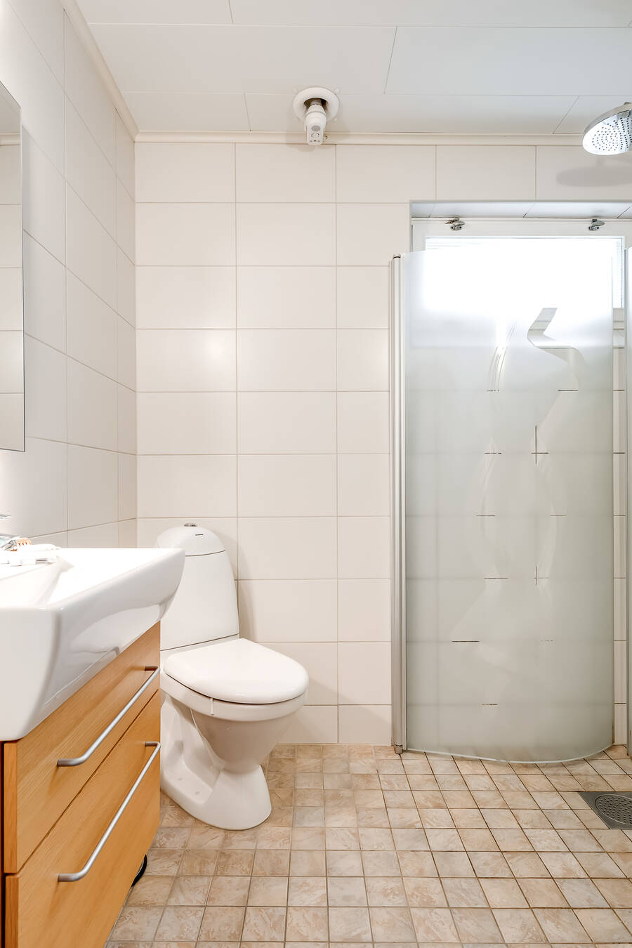 Det välplanerade duschrummet har klinkergolv med skön elgolvvärme och helkaklade väggar. Här finns wc, handfat i kommod med spegel ovan, ett stort och ett mindre väggskåp samt en duschplats med vikbara glasväggar med dekorativa motiv. Både vädringsfönster och mekanisk fläkt bidrar till en fräsch miljö.