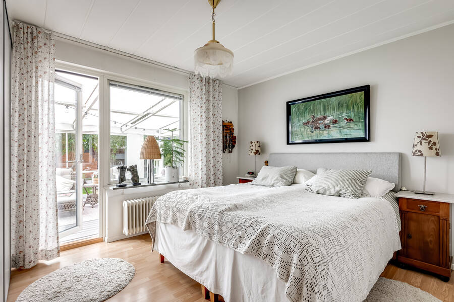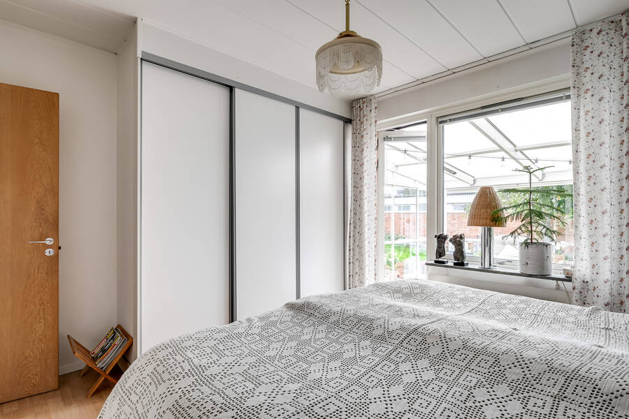 Det stora sovrummet har egen utgång till den inglasade altanen – en perfekt plats för morgonkaffet eller en lång helgfrukost. Även i sovrummet finns plats för förvaring bakom skjutdörrar.