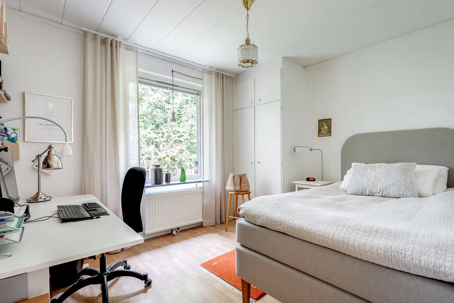Det mindre sovrummet passar lika bra som barnrum, gästrum eller hemmakontor. Fönstret vetter mot norr vilket gör rummet svalt och skönt.