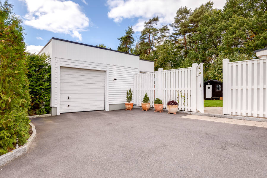 Den generösa, asfalterade garageuppfarten gör det enkelt att parkera flera bilar eller ställa upp husbil, husvagn eller båt – perfekt för den som uppskattar både yta och flexibilitet. För dig som vill ha bilen under tak finns ett rymligt garage med gott om plats även för förvaring. Här finns dessutom en elbilsladdstation som gör vardagen både smidigare och mer hållbar.