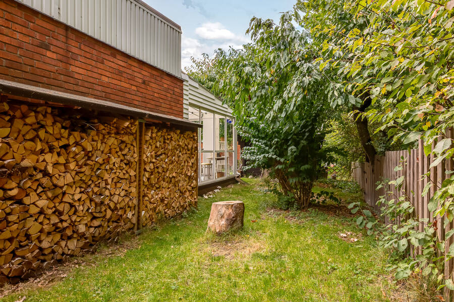 Trädgården är en liten oas – inhägnad och grön med plats för lek, odling och vila. Körsbärsträdet står i centrum, och bakom tomten breder skogsdungen ut sig – perfekt för små upptäcktsfärder eller en stilla promenad när kvällen faller. Här bor du med naturens närvaro, men ändå bara några minuter från shopping, kommunikationer och stadens puls.