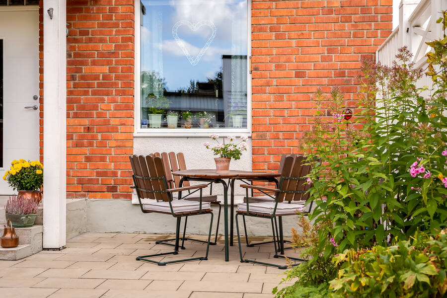 Den generösa altanen om ca 18 kvm är en riktig oas och kan användas under större delen av året. Den är dessutom åtkomlig såväl från det stora sovrummet som från trädgården. Här ryms både soffgrupp och matbord för härliga middagar i goda vänners lag.