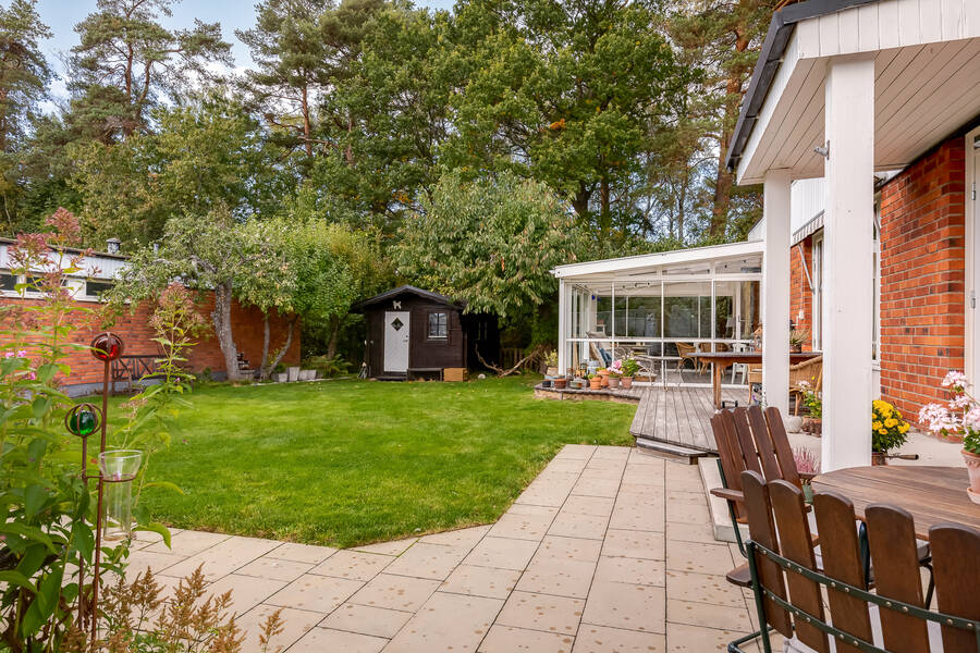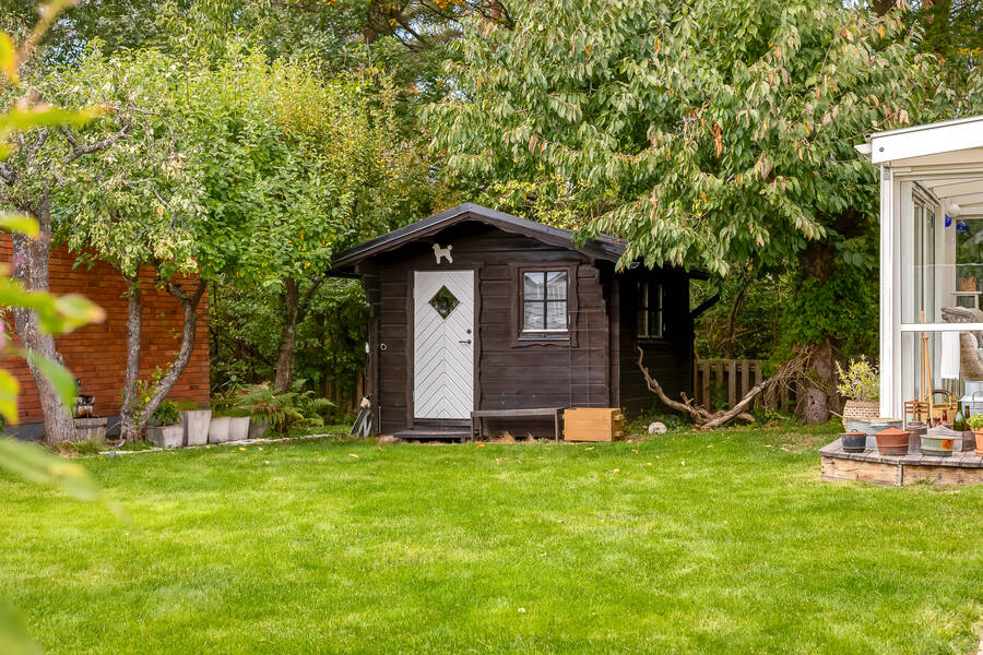 Som ett extra tillskott finns även en friggebod på tomten – idealisk för trädgårdsredskap, cyklar eller annan utrustning som behöver en skyddad plats.