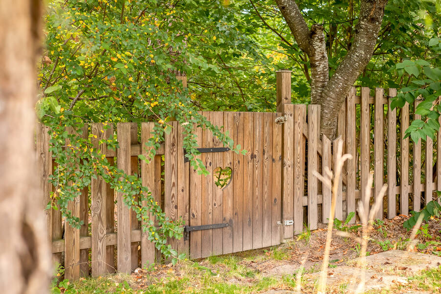Den inramade trädgården blir en trygg och trivsam plats för både barn och husdjur, tack vare att den omgärdas av byggnader, plank och staket. Mitt i grönskan står ett vackert körsbärsträd som med sina blomsterprakt markerar årstidernas skiftningar och under sommarens varmaste dagar skänker skön skugga till den inglasade altanen.