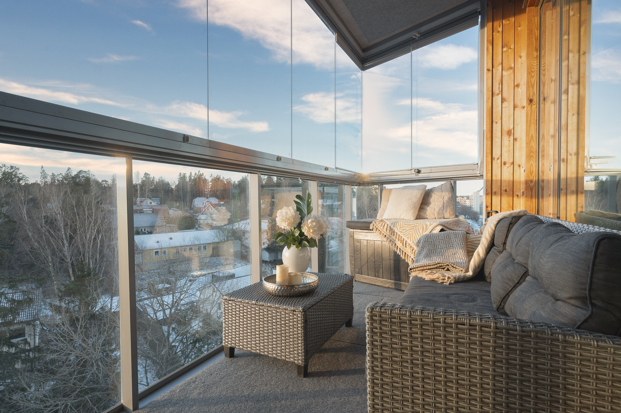 Den helinglasade balkongen används under större delen av året. Balkongen ligger i sydväst och på sjunde våningen, vilket ger sol under större delen av dagen och utsikt över omgivningarna. Praktiskt med skjutbara glaspartier där du själv reglerar regn- och vindskydd och när du vill öppna upp för att njuta av soliga stunder. Väggarna är klädda i trä och golvet har balkongmatta, vilket ger en varm och trivsam atmosfär. Här finns även eluttag.