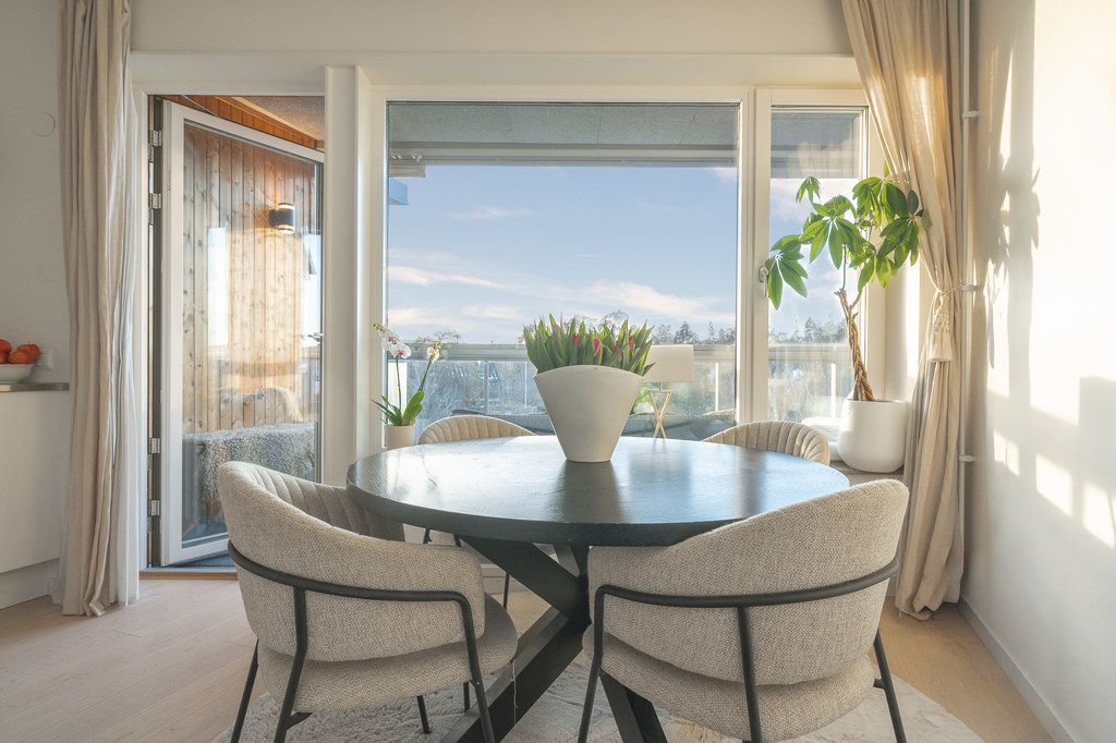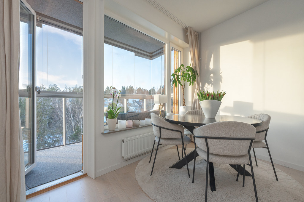 Vardagsrummet är rymligt och har öppen planlösning mot köket, vilket ger en social och lättmöblerad miljö. Här finns plats för både soffgrupp och matbord. De stora fönstren i söderläge släpper in generöst med ljus under större delen av dagen och skapar en trivsam atmosfär. Från rummet nås även den inglasade balkongen.