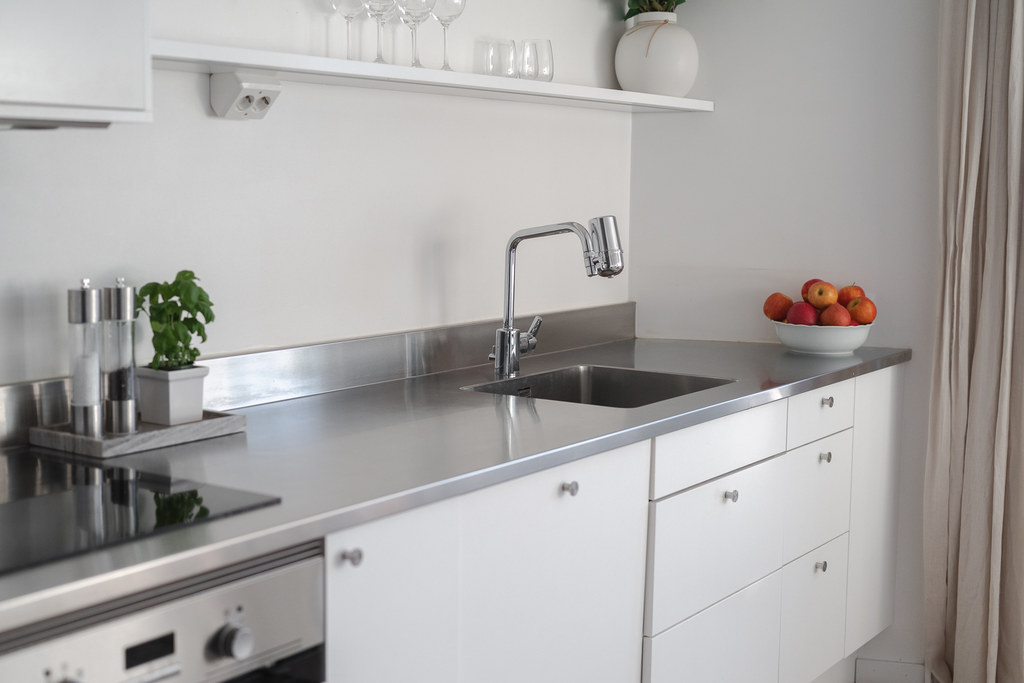Köket är från Marbodal och har släta luckor i polarvitt som ger en ren och tidlös känsla. Här finns integrerad kyl, frys och köksfläkt samt vitvaror från Electrolux. Den generösa bänkskivan i rostfritt stål, med upphöjd bakkant, bidrar både till generös arbetsyta och en mer exklusiv karaktär. Köket är utrustat med svart induktionshäll och ugn som kompletterar inredningen på ett modernt sätt.